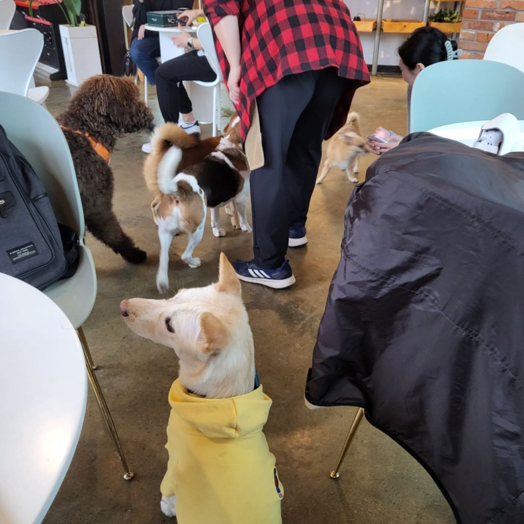 When we first arrived, Yeondu took a short walk on her leash, went outside to pee, and came back in to play with her friends. It’s a quite common thing for people to discriminate against jindos in Korea, but this particular cafe was very jindo friendly.
