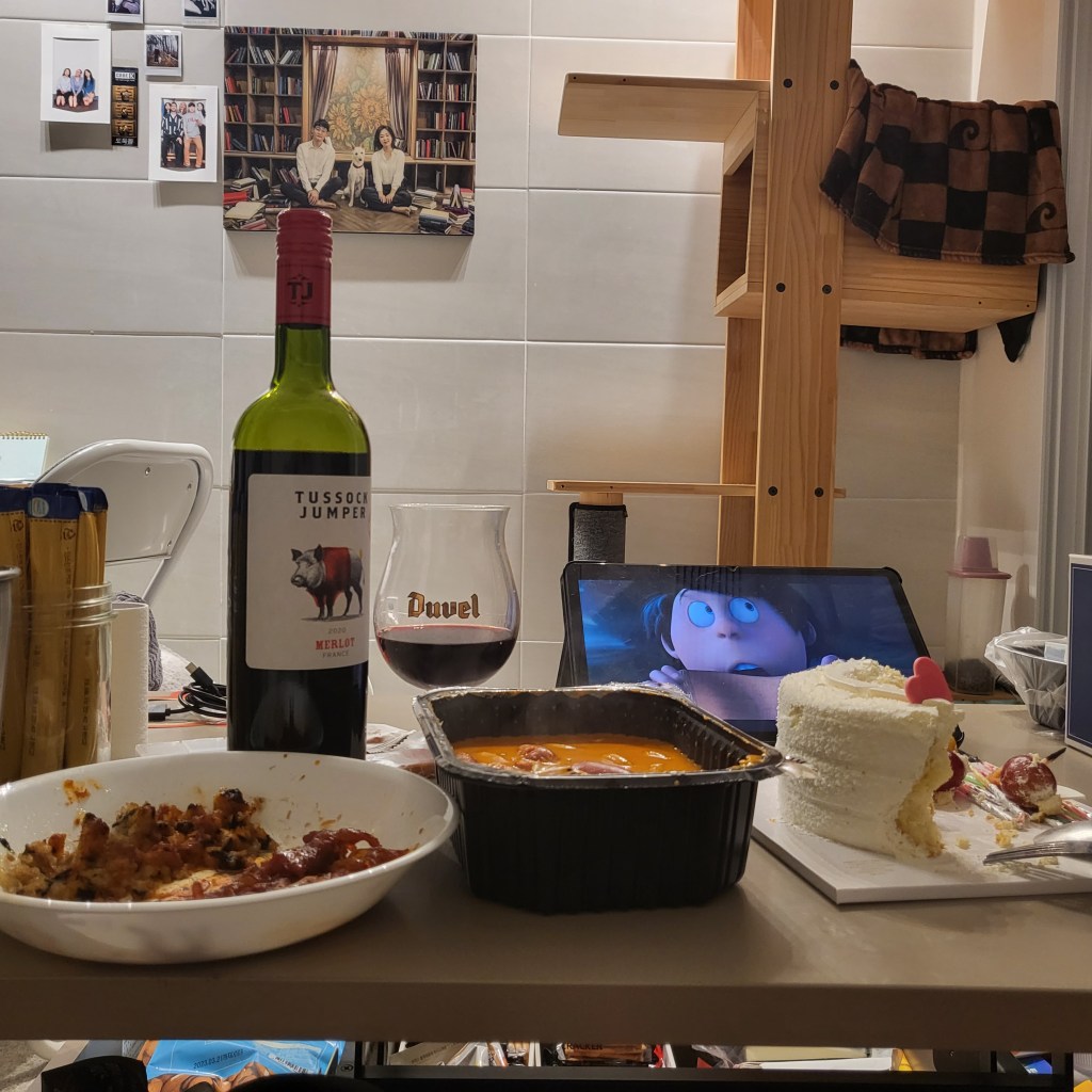 I’m allowed wine and beer in the middle of the day, and I pet some cats who came by to get some food. Cute.